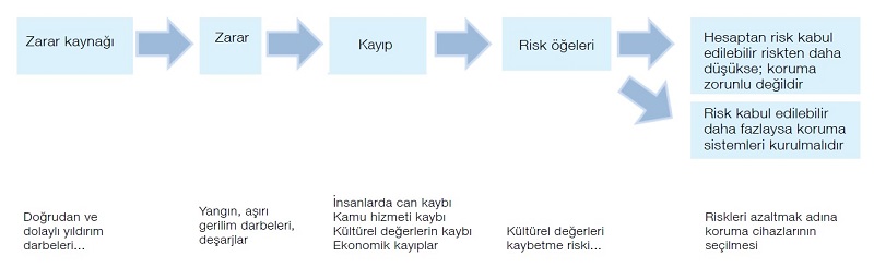 Her kayıp için bir risk R’si hesaplanmaktadır. R1 insanlarda hayat kaybı riskidir; R2 önemli toplum hizmetlerinin kaybı riskidir; R3 kültürel mirasın kaybı riskidir; R4 ise ekonomik kayıp riskidir. Her risk türü zarar sebebiyle (kişilerdeki adım ve temas potansiyellerinden kaynaklı zararlar; yangın, patlama vb. nedeniyle ortaya çıkan maddi zararlar; elektriksel sistemlerde gerilim darbeleri nedeniyle oluşan zararlar) ve kaynağıyla (binalara veya dış elektrik hatlarına doğrudan gelen yıldırım darbeleri, binaların veya hatların yakınına gelen dolaylı yıldırım darbeleri) ilgili olarak farklı öğelerin temelinde ifade edilebilir.